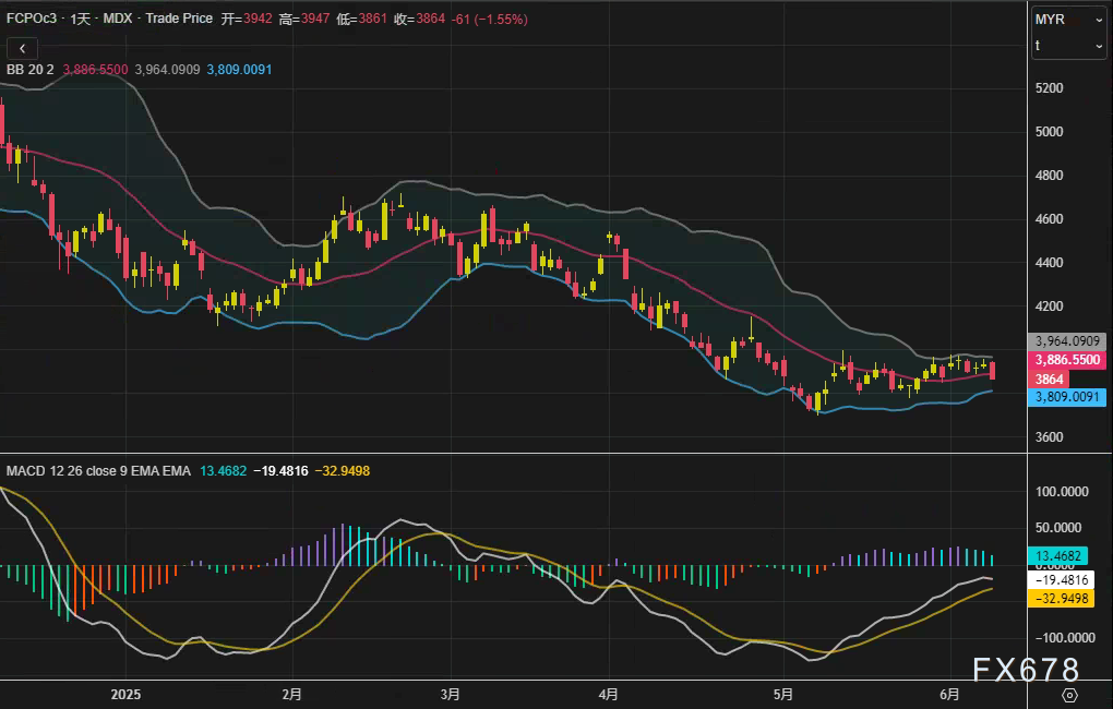 周二(6月10日),马来西亚衍生品交易所(BMD)棕榈油主力合约FCPOc3收于3864林吉特/吨,日内下跌61林吉特(1.55%),终结此前两日连涨。技术面显示,布林带中轨位于3964林吉特,MACD柱状图延续负值,短期动能偏弱。尽管价格承压,但盘中受6月出口数据提振,跌幅较午盘收窄。