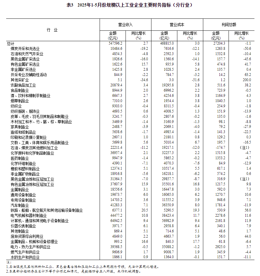 1—5月份,采矿业实现利润总额3580.4亿元,同比下降29.0%;制造业实现利润总额20201.4亿元,增长5.4%;电力、热力、燃气及水生产和供应业实现利润总额3422.5亿元,增长3.7%。