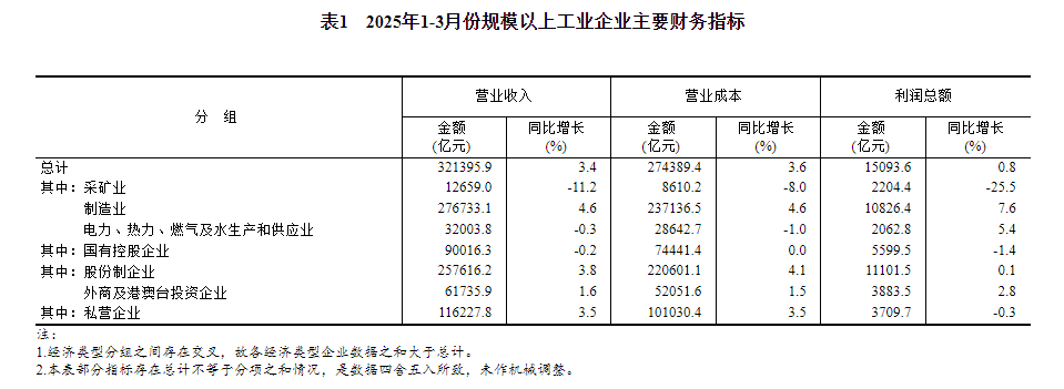 1—3月份,全国规模以上工业企业实现利润总额15093.6亿元,同比增长0.8%(按可比口径计算,详见附注二)。