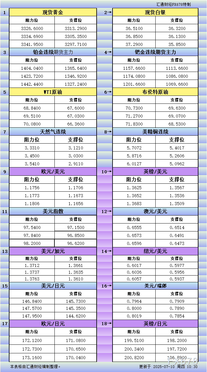 XM官网官网一张图看商品支撑阻力:金银油气+铂钯铜农产品期货(2025年7月9日